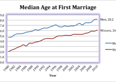 Median age at time of first marriage is on the rise. Since 1980, it has risen 3.5 years for women…