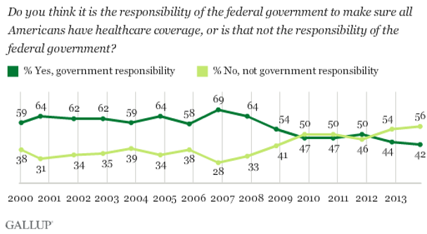 Despite Gallup's recent criticisms regarding its inaccuracies, I came across this chart in anticipation of preparing for an upcoming public policy discussion titled -- "Is Healthcare a Right or a Privilege?" Apparently this is the only recent poll that I found.