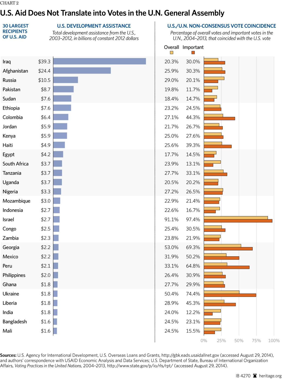 Of the 30 largest recipients of U.S. aid worldwide, only three voted for than half the time with the U.S. on overall votes in the U.N. General Assembly.