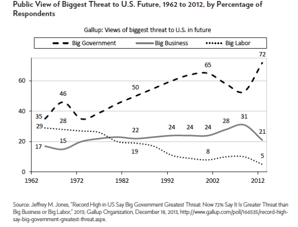 An overwhelming majority of Americans have identified the greatest threat to the future of our nation: big government. While concern over unions and business has declined recently, the percent of people who view the federal government as a threat has increased by nearly 40 percent.