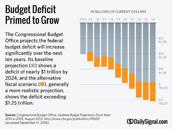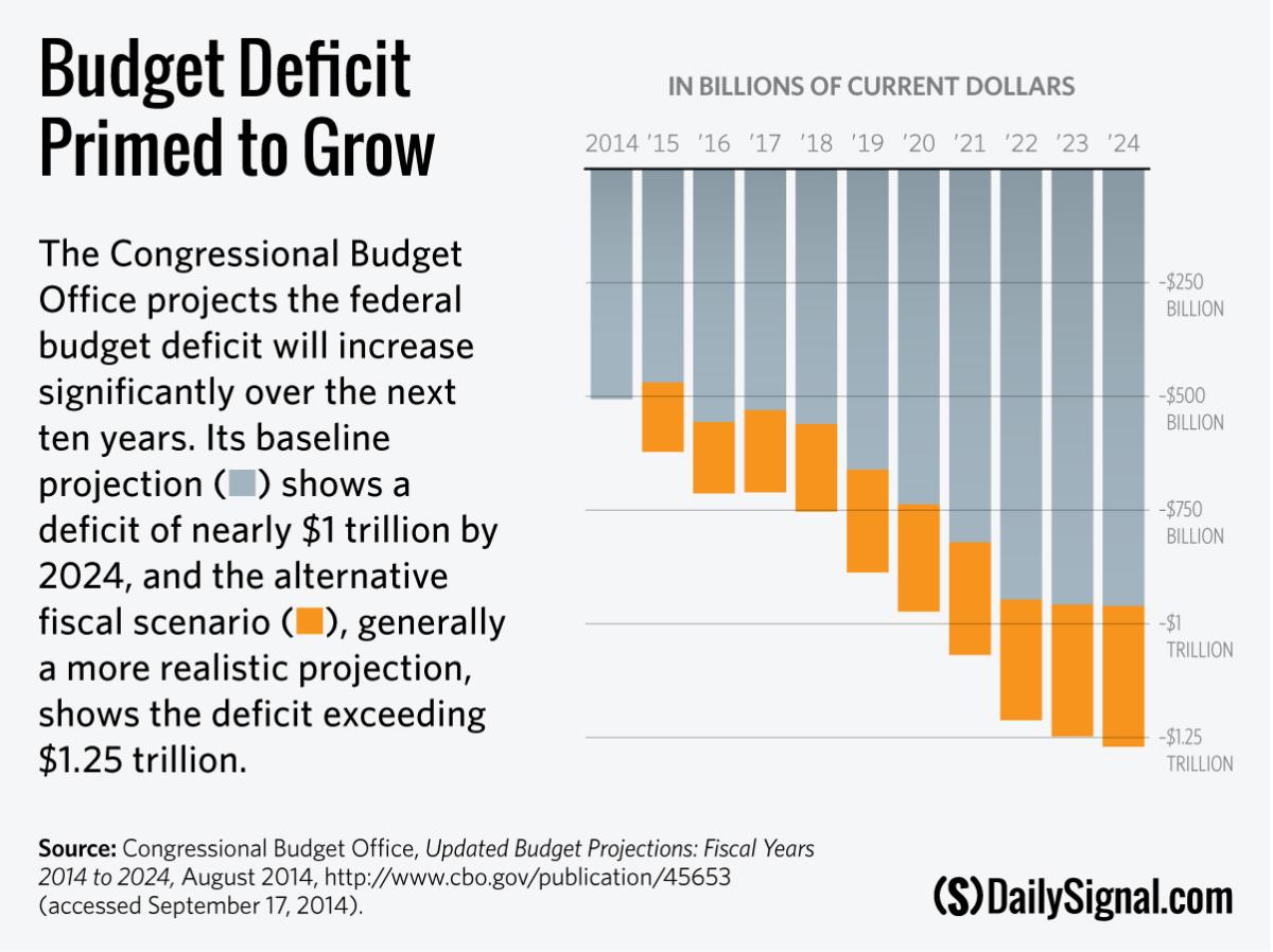 The Congressional Budget Office projects the federal budget deficit will increase significantly over the next ten years. Its baseline projection (n) shows a deficit of nearly $1 trillion by 2024, and the alternative fiscal scenario (n), generally a more realistic projection, shows the deficit exceeding $1.25 trillion.