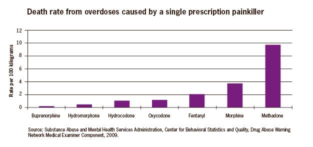 Methadone has the highest death rate among prescription painkillers, causing over 9 deaths per 100 kilograms of Methadone.