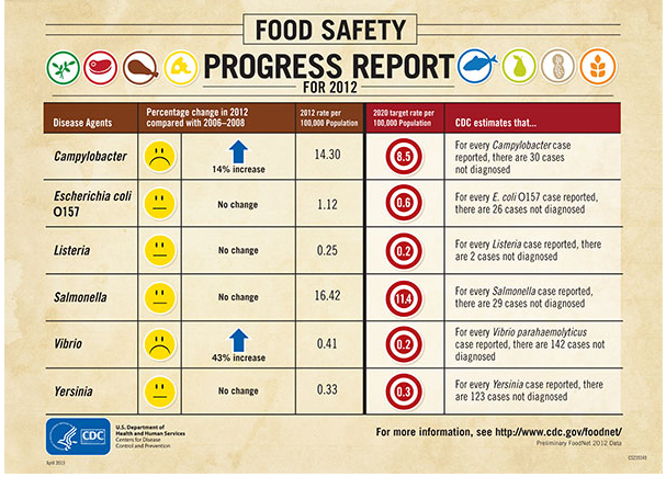 Foodborne illnesses caused by Campylobacter and Vibrio increased in 2012 from 2006-2008. For other disease-causing agents there was no change. This means no progress was made in reducing foodborne illness.