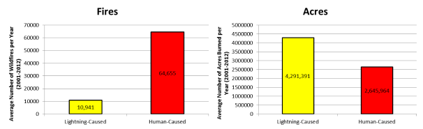 On average, there were more human-caused wildfires (64,655) per year than lightning-caused wildfires (10,941) in the U.S. from 2001-2012. However, on average there were more acres burned by lightning-caused wildfires (4,291,391) than by human-caused wildfires (2,645,964).