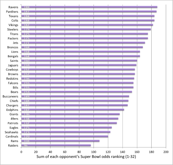 As of Week 9 in the AFC South there is a close battle between Indianapolis and Houston both of which have very favorable games for the remainder of the season. Also, looking at the schedule that the Seahawks are facing--it wouldn't be too surprising to see Seattle live up to the Super Bowl Curse and miss the playoffs this year. Even though the Panthers lost to the Saints this Thursday who are leading their division, Carolina's schedule sets them up to take over late in the season and make playoffs.