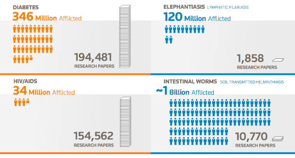 Neglected Tropical Diseases are a group of tropical infections which are especially endemic in low-income populations in developing regions of Africa, Asia, and the Americas. These diseases infect more than one billion people in the world and are responsible for over half a million deaths annually. Research on these was significantly lower (measured by the number of published papers) than for other diseases, such as HIV/AIDS, with less afflicted people.