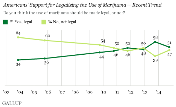 A recent Gallup poll shows the majority of Americans support pot legalization. Compare the numbers from 2004, where we see a huge gap between supporters and opposers. Let's take out the peace pipe everyone!
