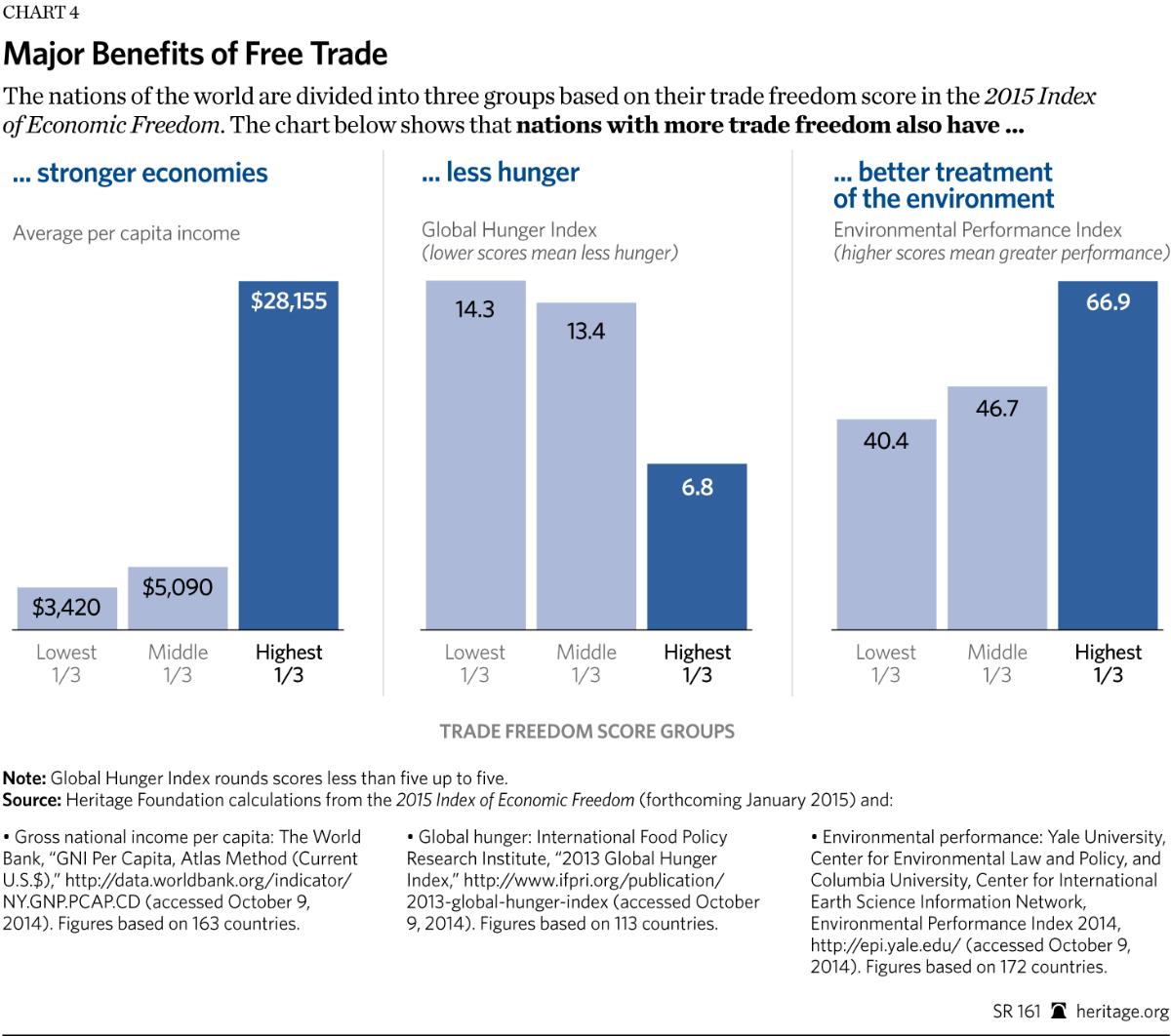 The nations of the world are divided into three groups based on their trade freedom score in the 2015 Index of Economic Freedom. The chart below shows that nations with more trade freedom also have stronger economies, less hunger, and better treatment of the environment.