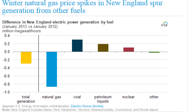 An increase in natural gas demand from New England's limited supply caused a spike in prices. This reduced natural gas use for power generation and generation from other fuel sources increased. The decrease in natural gas generation was cushioned by coal and nuclear power. These were at higher rates in 2013 than they were in 2012.