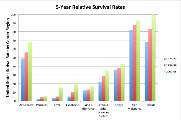 While surviving certain cancers has become nearly assured, cancers of the pancreas, lung, esophagus, and liver have continued to kill at alarming rates. The former three are directly related to smoking, and liver cancer to alcohol. There exists a statistically significant disparity between all races and African Americans, for all cancers, 1975-77, 39%, 1987-89 43%, and 2002-08 60%.