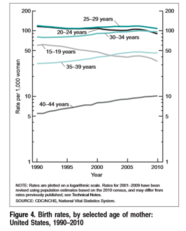 Birth rates for the 15-19 year old age group showed a decrease from 1990 to 2010. Meanwhile, birth rates increased for mothers aged 35-39 and 40-44 years old. These trends indicate that mothers are delaying childbirth and having children at older ages.