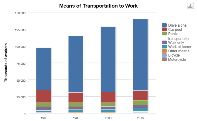 The number of people carpooling to work has decreased from 19.1 million people in 1980 to just 14.4 million in 2010. More Americans are now driving alone to work, with 43 million more people driving alone in 2010 (105.8 million) than in 1980 (62.2 million). Working at home has also become more popular, while walking to work has lessened.