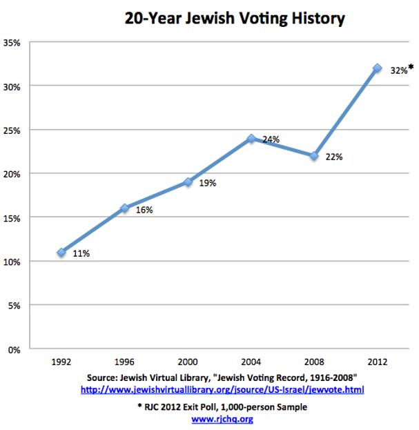 Share of the Jewish vote for the Republican nominee for President from 1992 through 2012.