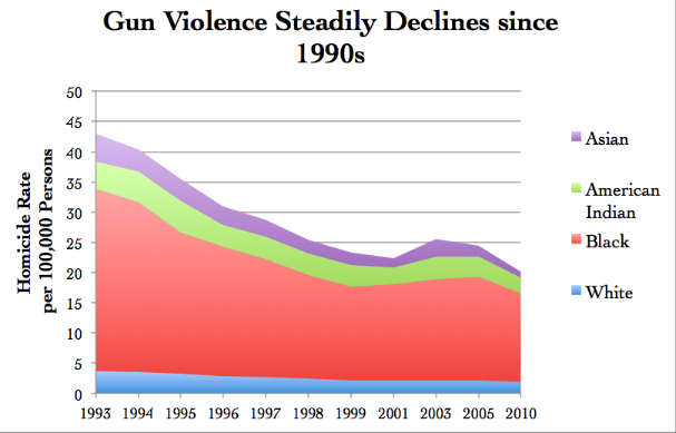 Since peaking in 1992, gun violence declined steadily throughout the 90’s and early-2000s. Current homicide rates have not been seen since the early-1960s. However, most Americans are unaware of this trend: 56% said they believe gun-violence to be higher today than it was 20 years ago, with only 12% believing it is lower. Suicides constitute 6-in-every-10 gun-deaths.
