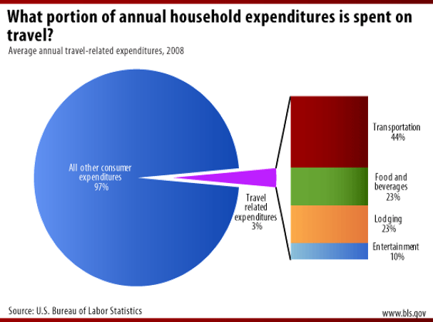In 2008, only 3% of household expenditures in the U.S. were travel related expenditures, equivalent to $1,415 spent per household. Transportation accounted for 44% of travel expenditures, while food and lodging each accounted for 23%.