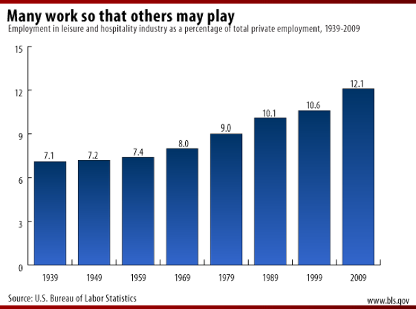Employment in the leisure and hospitality industry has been steadily increasing since the 1940s. As a percentage of total private employment, leisure and hospitality employment has increased from 7.1% in 1939 to 12.1% in 2009.