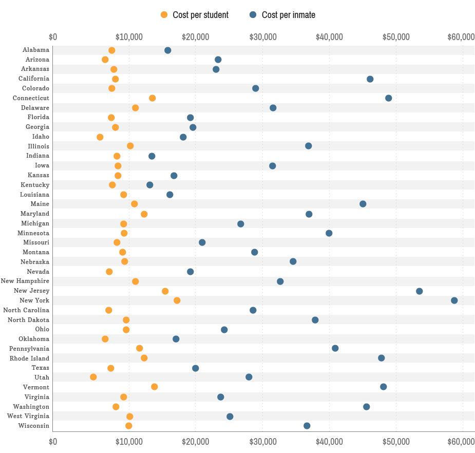 This chart displays the amount of money each state spends on a student's education per year in comparison to the amount of money a state spends on an inmate per year. The education data was collected from the US Census Bureau and the inmate data was collected from the Vera Institute.