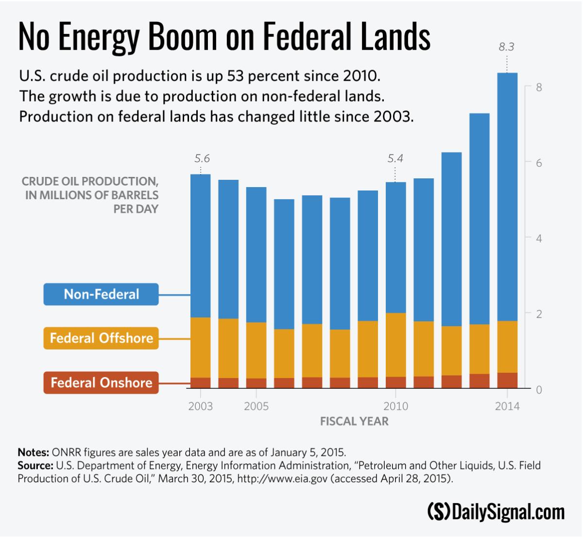 U.S. crude oil production is up 53 percent since 2010. The growth is due to production on non-federal lands. Production on federal lands has changed little since 2003.