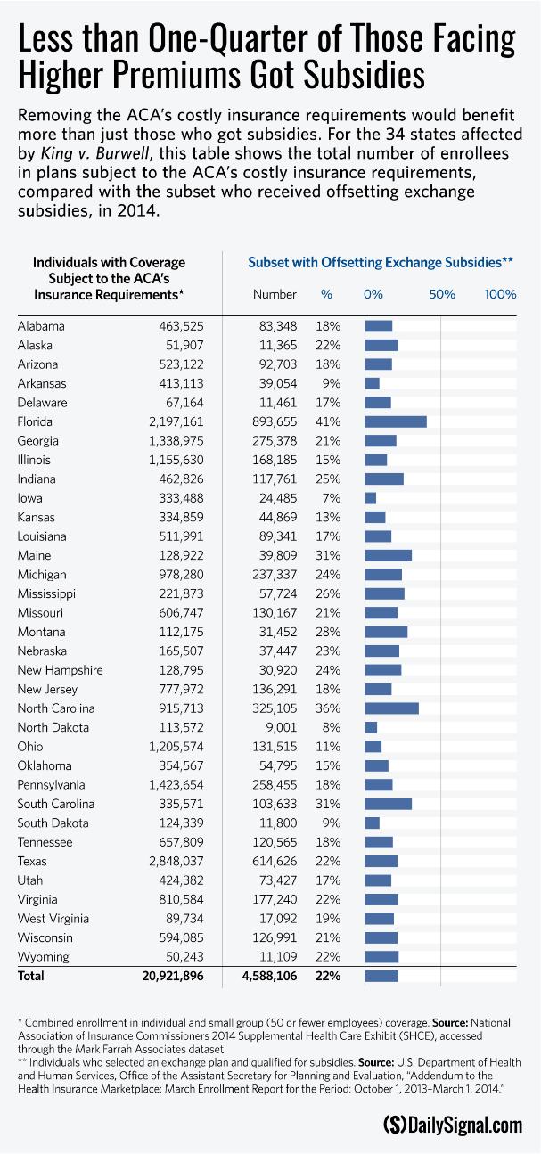 Removing the ACA’s costly insurance requirements would benefit more than just those who got subsidies. For the 34 states affected by King v. Burwell, this table shows the total number of enrollees in plans subject to the ACA’s costly insurance requirements, compared with the subset who received offsetting exchange subsidies, in 2014.
