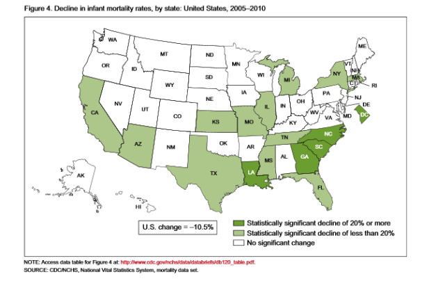 From 2005 to 2010, Georgia, Louisiana, North Carolina, South Carolina and the District of Columbia experienced a decline of 20% or more in their infant mortality rates. Historically, these states had notoriously high infant mortality rates. States with the largest declines in infant mortality rates tended to be states with typically higher rates.