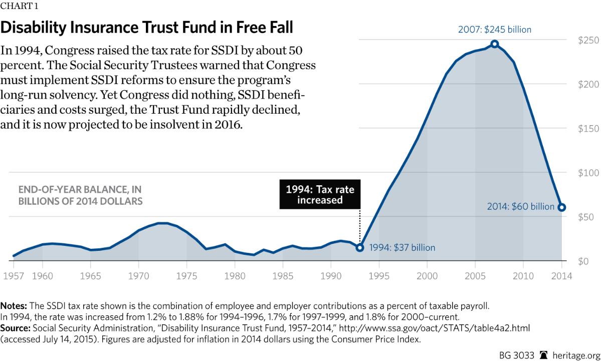 In 1994, Congress raised the tax rate for SSDI by about 50 percent. The Social Security Trustees warned that Congress must implement SSDI reforms to ensure the program’s long-run solvency. Yet Congress did nothing, SSDI beneficiaries and costs surged, the Trust Fund rapidly declined, and it is now projected to be insolvent in 2016.