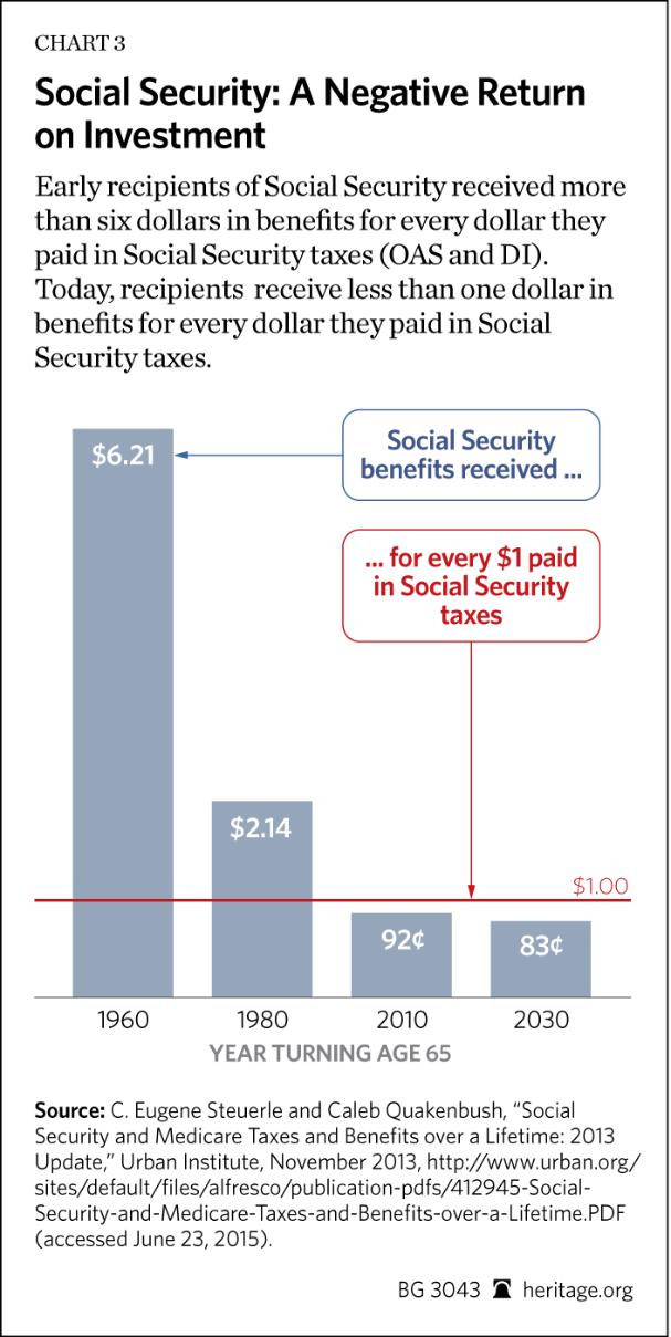 Early recipients of Social Security received more than six dollars in benefits for every dollar they paid in Social Security taxes (OAS and DI). Today, recipients receive less than one dollar in benefits for every dollar they paid in Social Security taxes.