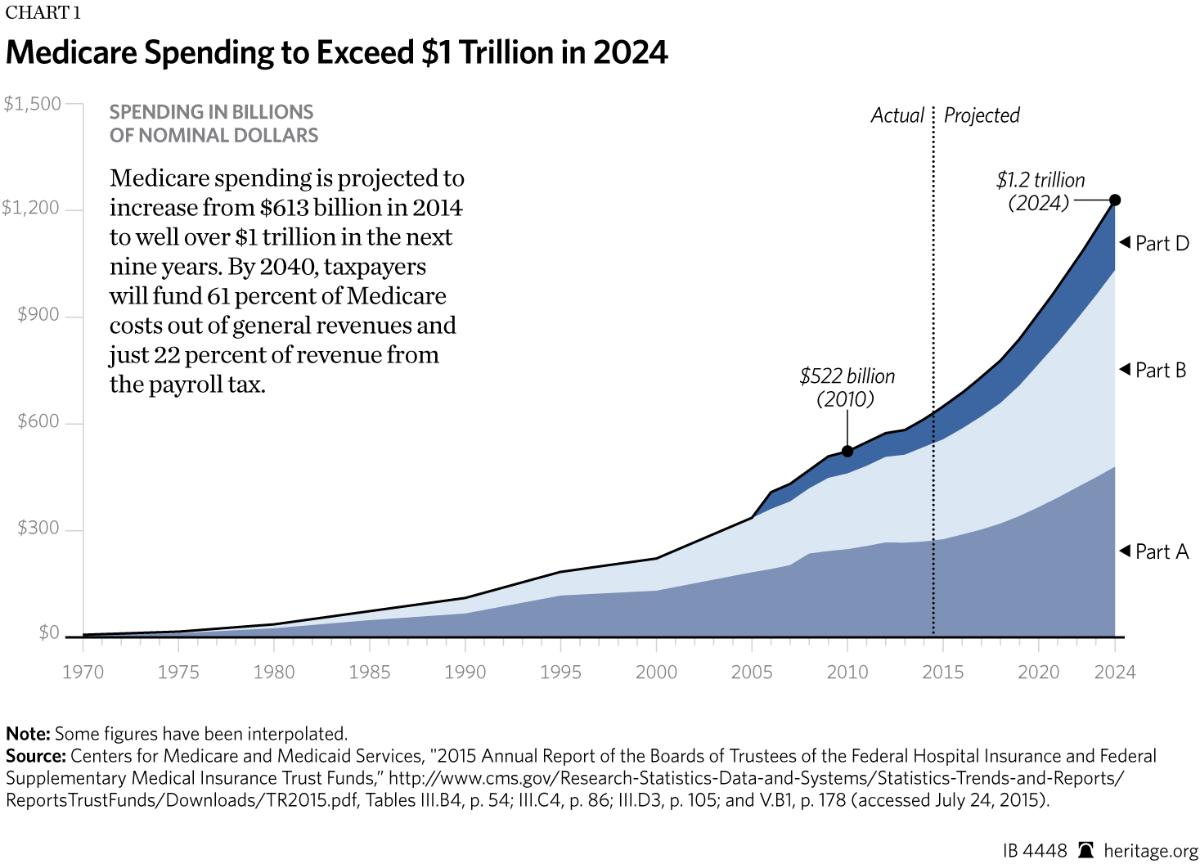 Medicare spending is projected to increase from $613 billion in 2014 to well over $1 trillion in the next nine years. By 2040, taxpayers will fund 61 percent of Medicare costs out of general revenues and just 22 percent of revenue from the payroll tax.