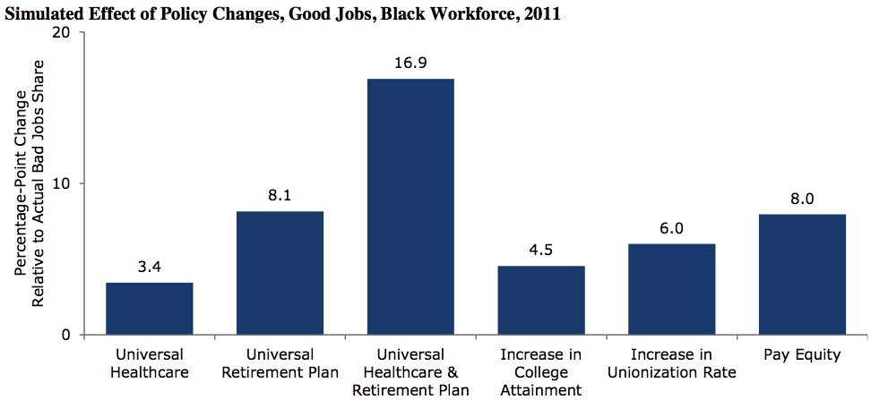 In our white paper on black workers and good (>$19/hr, health insurance, retirement plan) vs. bad jobs, the policy changes above were analyzed to determine what would bring the greatest number of black workers into the good job category. (Click black-workers tag for related charts and click source for full white paper.)