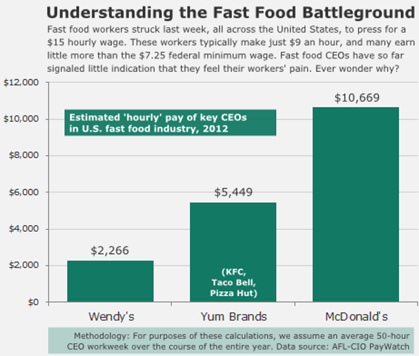 Back in the 1960s, hardly any American corporate CEOs took home more than 50 times what typical workers made. By 1993, CEOs were averaging 195 times worker pay. The current average differential: 354 times. And these are the people suggesting that raising the minimum wage would ruin our economy.