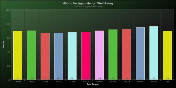 The Gross National Happiness Index for the domain of mental well-being - a sense of purpose, optimism, accomplishment - increases as we age. These results are from over 25,500 people who took the survey between March 2011 and September 2013.