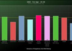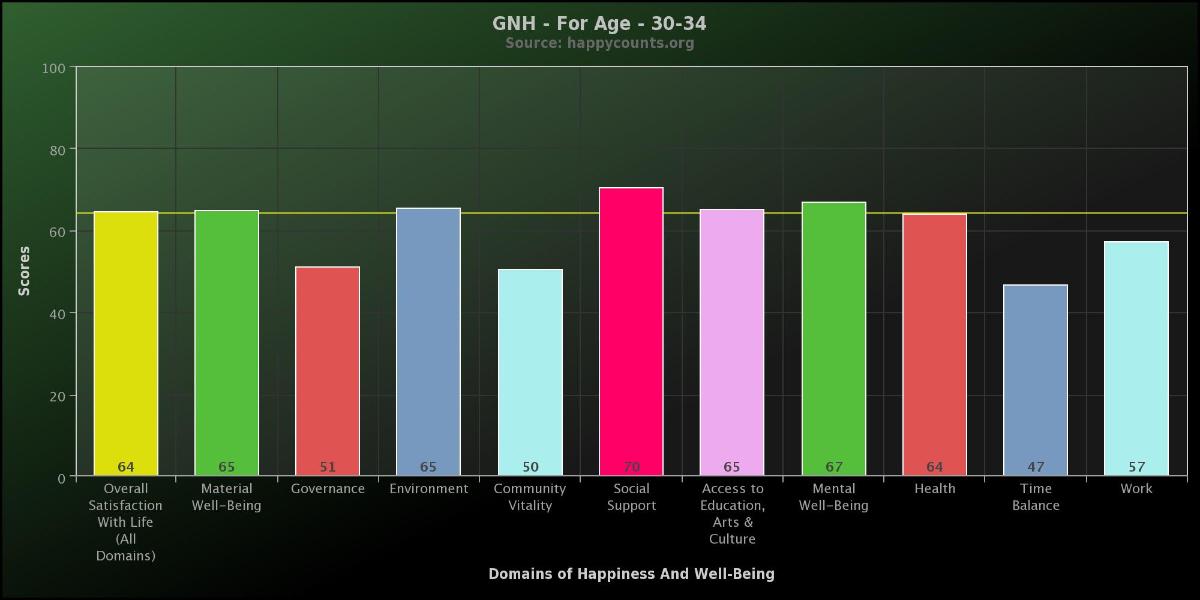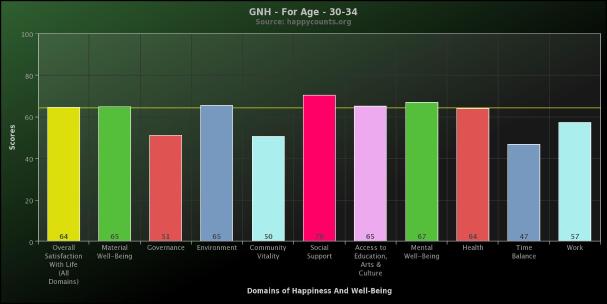 These are the Gross National Happiness Index scores for people age 30-34 These results are from over 25,500 people who took the survey between March 2011 and September 2013.