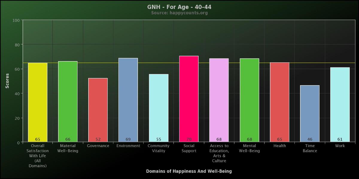 These are the Gross National Happiness Index scores for people age 40-44 These results are from over 25,500 people who took the survey between March 2011 and September 2013.