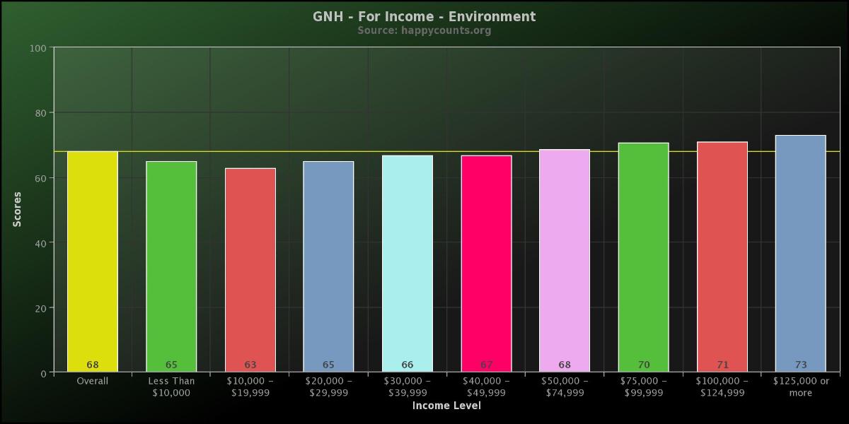 The Gross National Happiness score for the domain of the environment indicates people who earn more are more satisfied with the quality of their environment and efforts underway to preserve and conserve it. These results are from over 25,500 people who took the survey between March 2011 and September 2013.