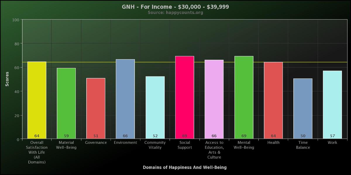These are the Gross National Happiness Index scores for people with income between 30 -39,999K. These results are from over 25,500 people who took the survey between March 2011 and September 2013.