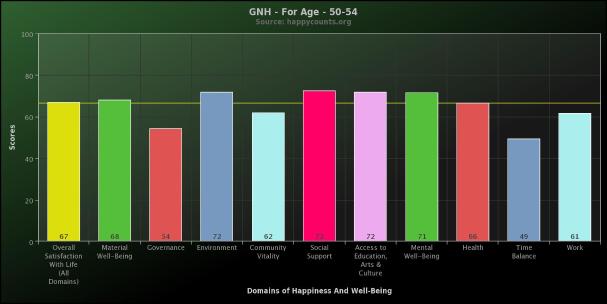 These are the Gross National Happiness Index scores for people age 50-54 These results are from over 25,500 people who took the survey between March 2011 and September 2013.
