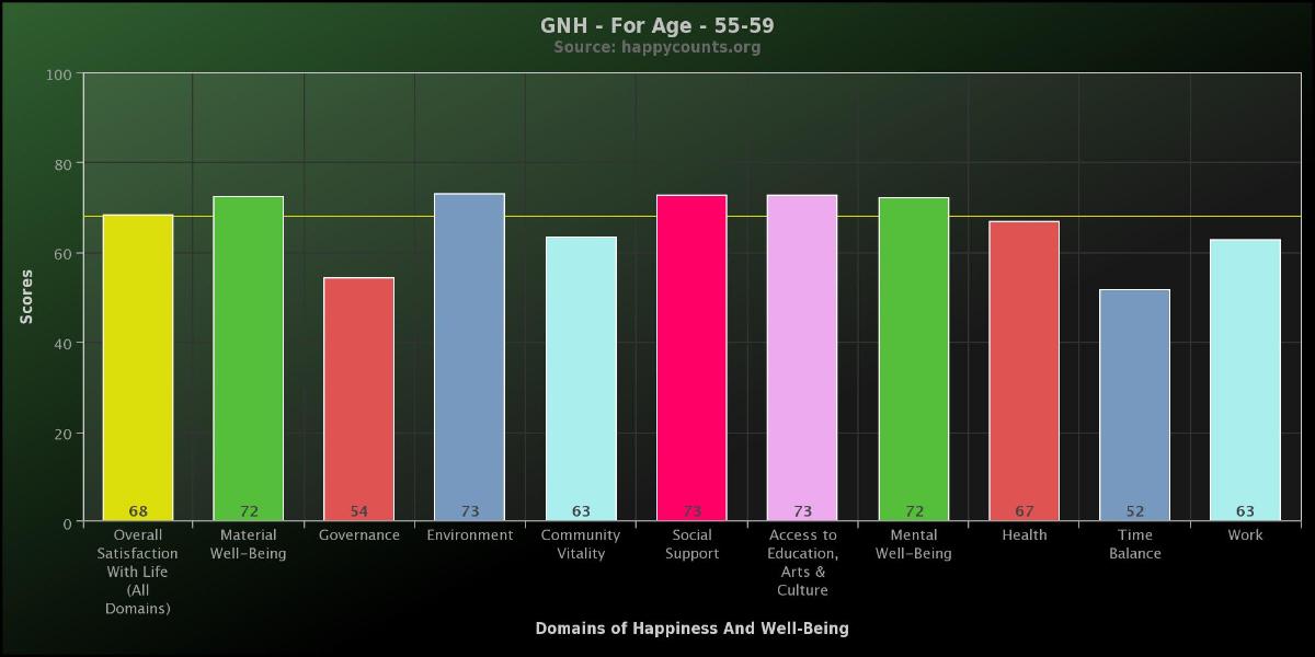 These are the Gross National Happiness Index scores for people age 55-59 These results are from over 25,500 people who took the survey between March 2011 and September 2013.