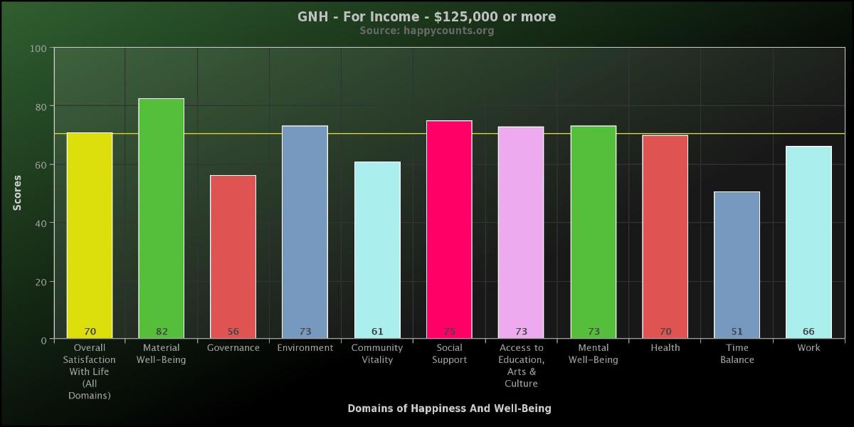 These are the Gross National Happiness Index scores for people with income 125,000 and above. These results are from over 25,500 people who took the survey between March 2011 and September 2013.