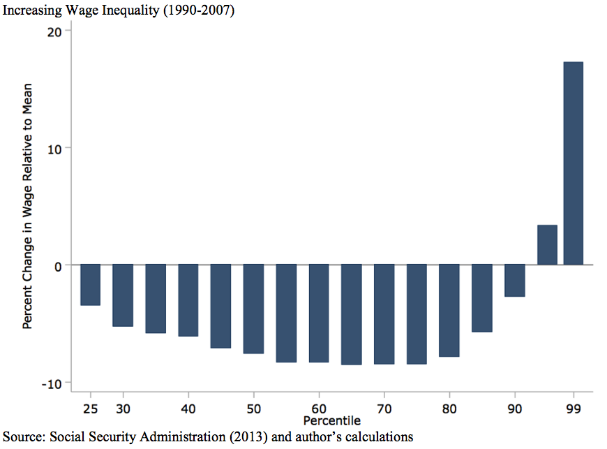 From 1990 to 2007, wage inequality in the U.S. increased significantly. The bottom 90-95% went down. The top 5% went up with the top 1% going way up. This is driven in part by trade agreements like the Trans-Pacific Partnership (TPP trade agreement). Read our white paper to better understand how TPP hurts our middle class.