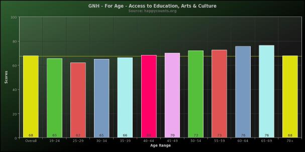 The Gross National Happiness Index for the domain of Education, Arts and Culture tells us that as we age, we are more engaged and satisfied with access to informal education, as well as participation and spectatorship of arts and recreation.These results are from over 25,500 people who took the survey between March 2011 and September 2013.