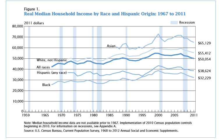 Historically, non-Hispanic whites had higher real median household incomes when compared to other races. However, they were quickly surpassed by the Asian population. Blacks tend to have the lowest real median household income of any race.