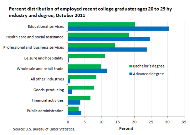 Among the employed 2011 recipients of bachelor’s or advanced degrees, about 2 in 5 found work in educational and health services. Twenty percent of recent bachelor’s degree recipients and 30 percent of recent advanced degree recipients were employed in educational services.
