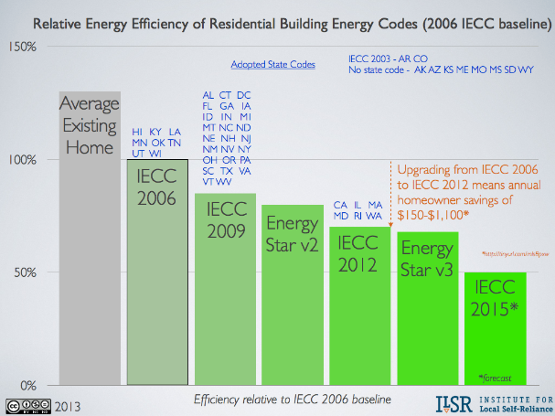 This charts tries to decode the energy code used to set minimum standards for building energy efficiency in most states. Tougher standards mean big energy savings for building owners.