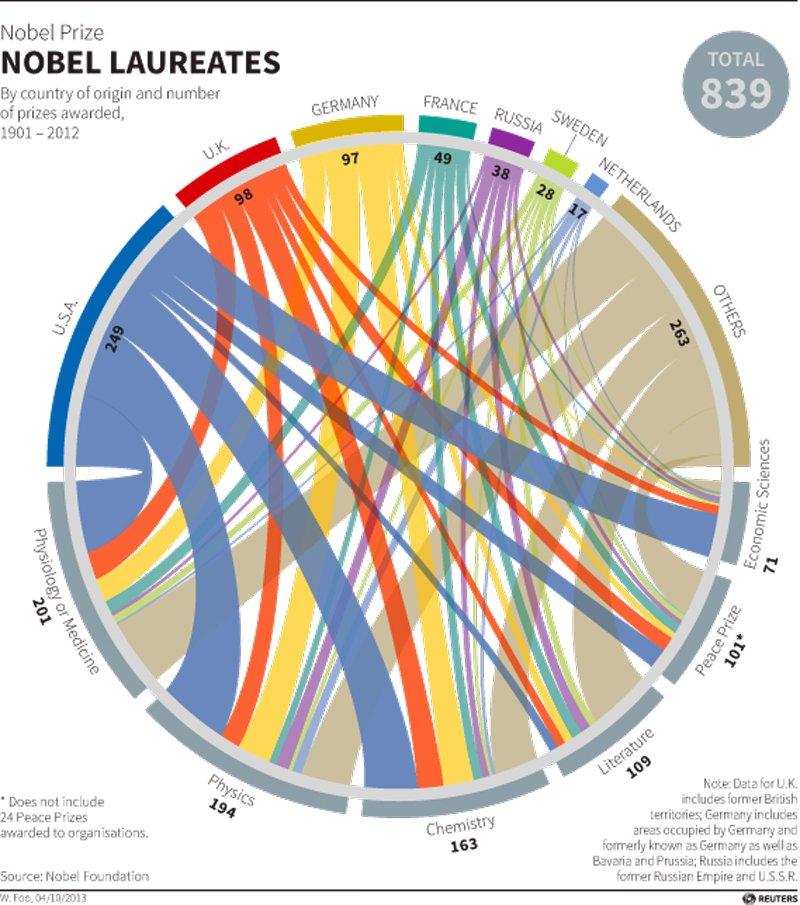 The first Nobel Prize was given in 1901 for Physics, Chemistry, Physiology or Medicine, Literature, and Peace, while the Economics Nobel Prize was not created until 1968. Now, each prize carries with it an award of 8 million Swedish Krona (more than $1 million USD).