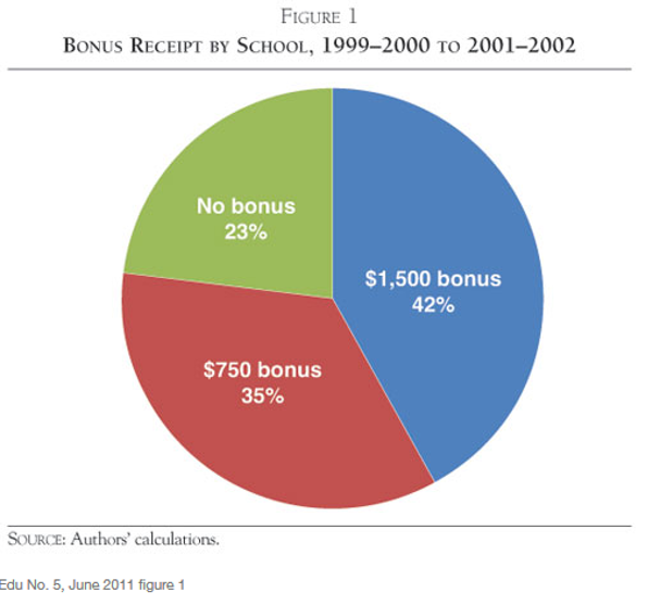 North Carolina has operated one of the country's largest pay-for-performance teacher-bonus programs since the late 1990s. This chart shows the proportion of schools in the 1999-2000 to 2001-2002 school years qualifying for $750 or $1,500 bonuses. Roughly 75 percent of the schools in the state received bonuses, but fewer than half received $1,500. The average bonus paid out was $890.