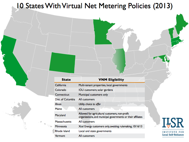 10 states and the District of Columbia allow virtual net metering or "shared renewables," a policy that allows many people to share the electricity output from a common renewable energy facility.
