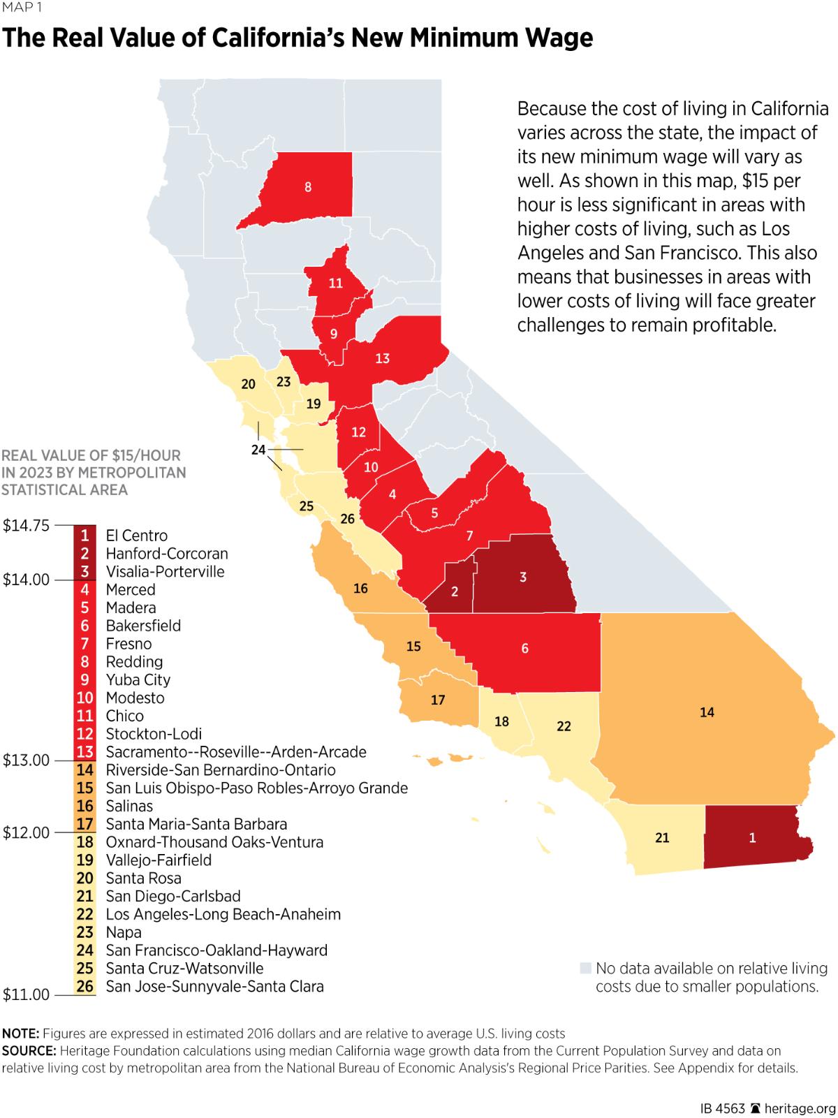 Because the cost of living in California varies across the state, the impact of its new minimum wage will vary as well. As shown in this map, $15 per hour is less significant in areas with higher costs of living, such as Los Angeles and San Francisco. This also means that businesses in areas with lower costs of living will face greater challenges to remain profitable.