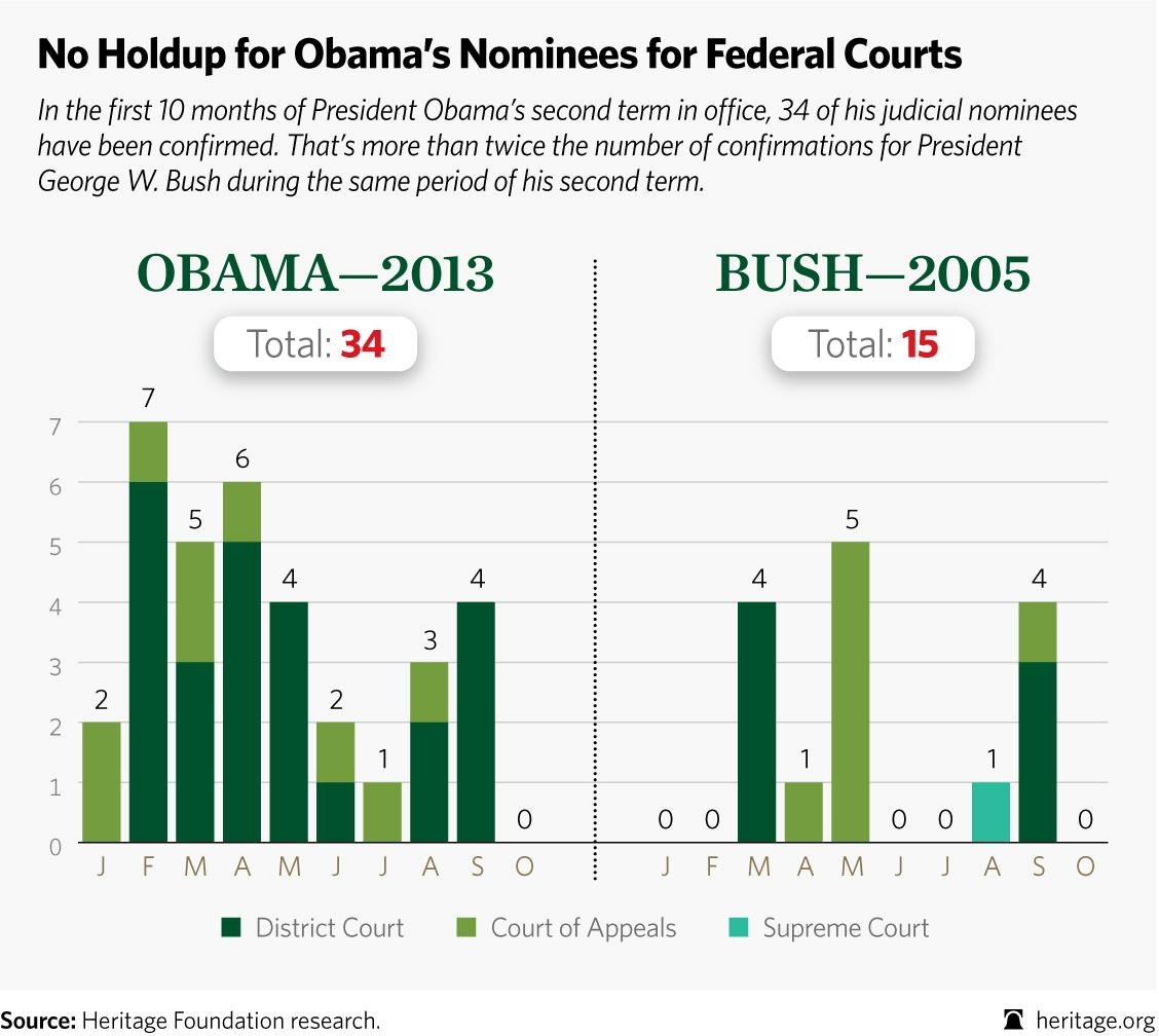 In the first 10 months of President Obama’s second term in office, 34 of his judicial nominees have been confirmed. That’s more than twice the number of confirmations for President George W. Bush during the same period of his second term.