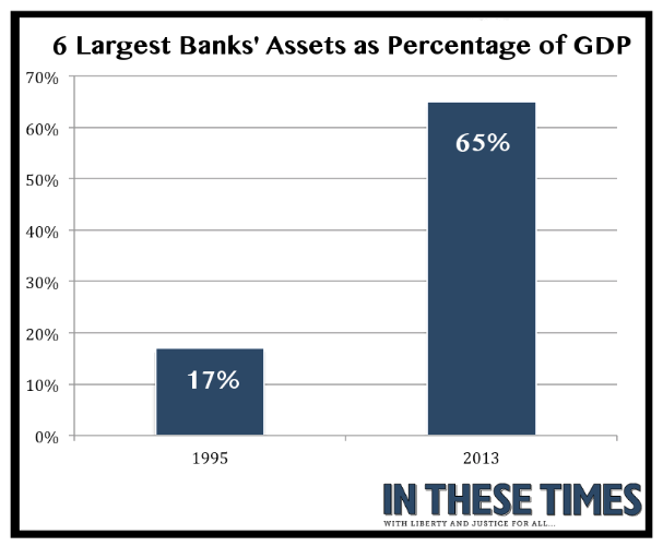 The six largest banks in the US now have assets that equal 65% of the country's GDP, which is nearly a 400% increase from their assets in in the mid-90s.