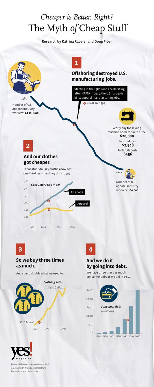 What do we really trade for all of the cheap stuff we buy? From 1980 to 2010, the U.S. lost 90% of its apparel manufacturing jobs. Because of this offshoring, our clothes cost 1/3 less in constant dollars today than in 1980, so we spend double what we used to and have three times more consumer debt as in 1994.
