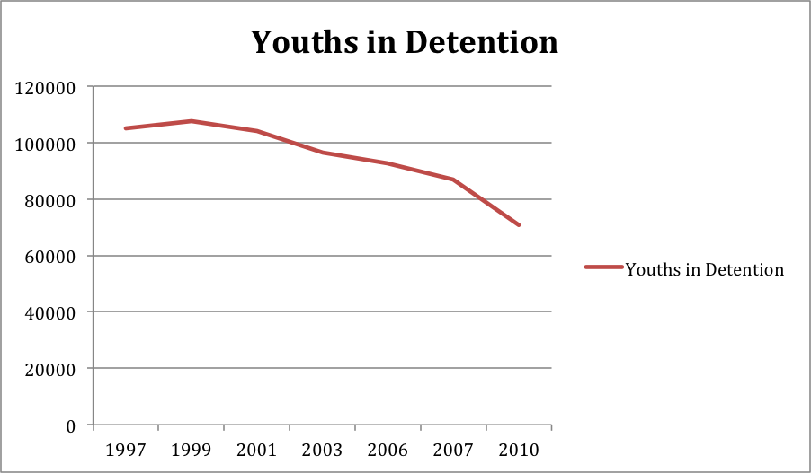 The number of under 18 year olds in detention in the United States has been declining since the beginning of the millennium. Current estimates state that there are 60,000 youths in detention on any given day in the US.